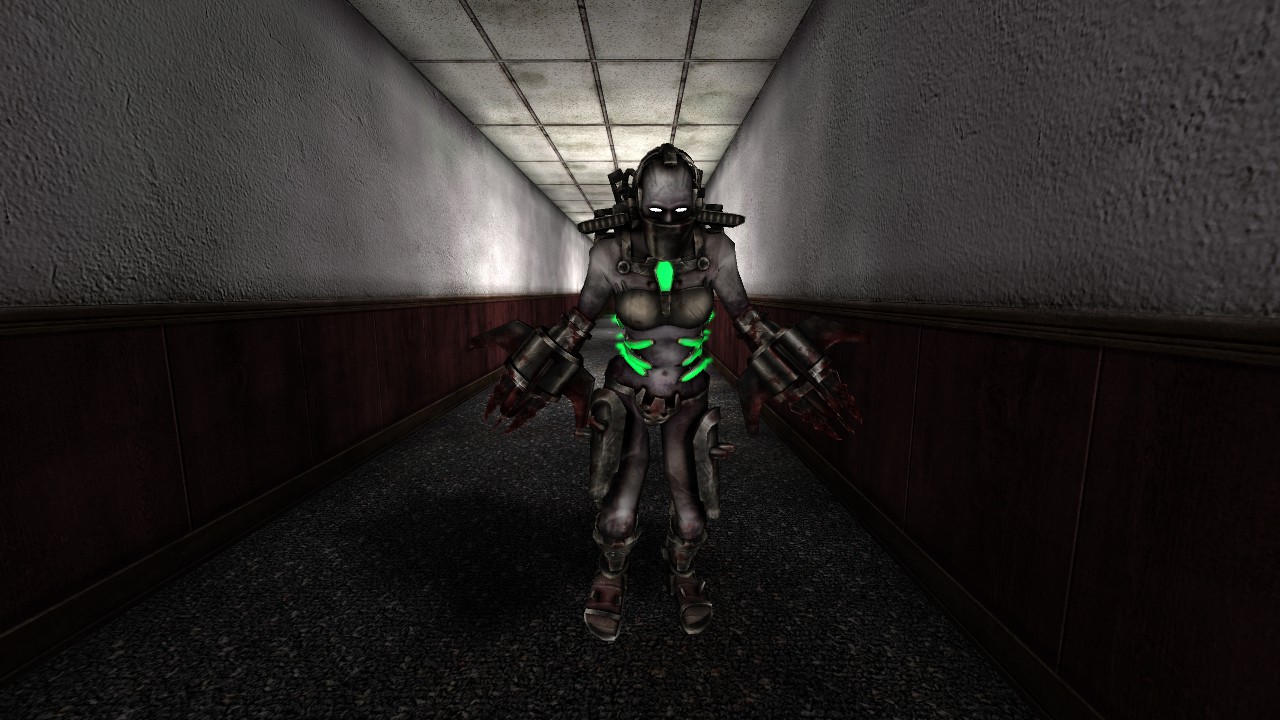 The fleshpound appears as an extremely muscular and tall figure with many metal plates on it.